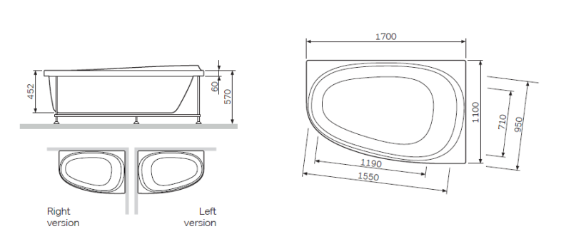 W80A-170R110W-A Like, ванна акриловая 170х110 см, правосторонняяДАННЫЕ ОБ ИЗДЕЛИИ:Ширина изделия(мм) 1700