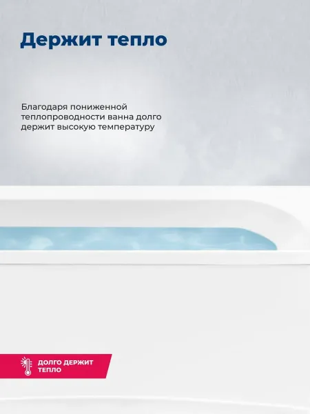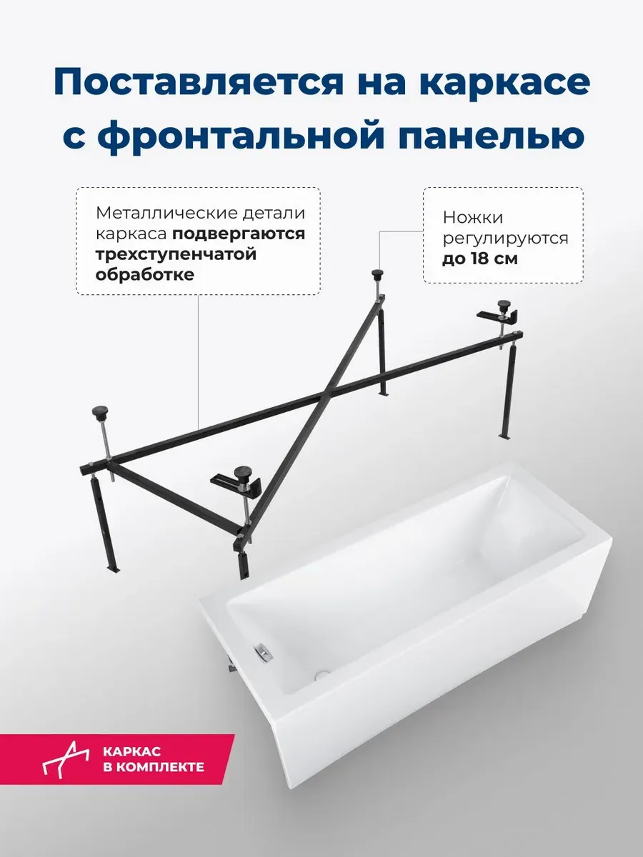 Пологая спинка спроектирована таким образом, что обеспечиваются комфорт и расслабление мышц тела. Расположение слива стандартное — в области ног. Модель установлена на прочный и устойчивый металлический каркас с регулируемыми ножками, позволяющими расположить ее на удобной высоте.