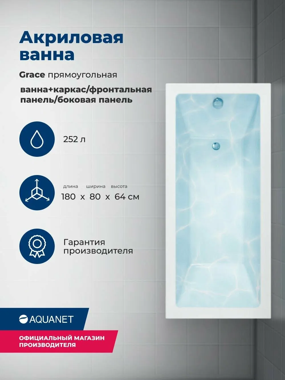 Акриловая ванна Aquanet Grace 347879 180x80 см с каркасом с фронтальной и боковой панелями купить