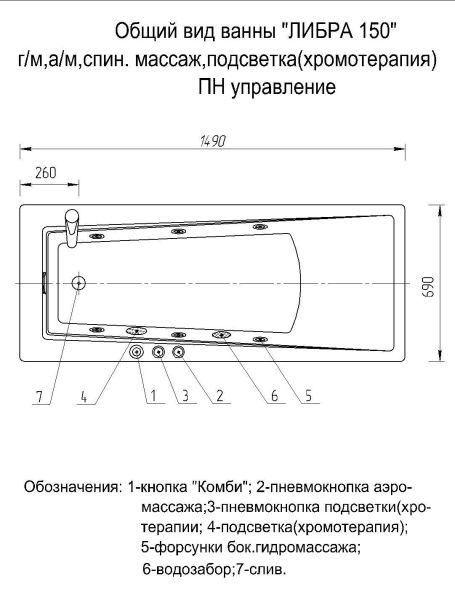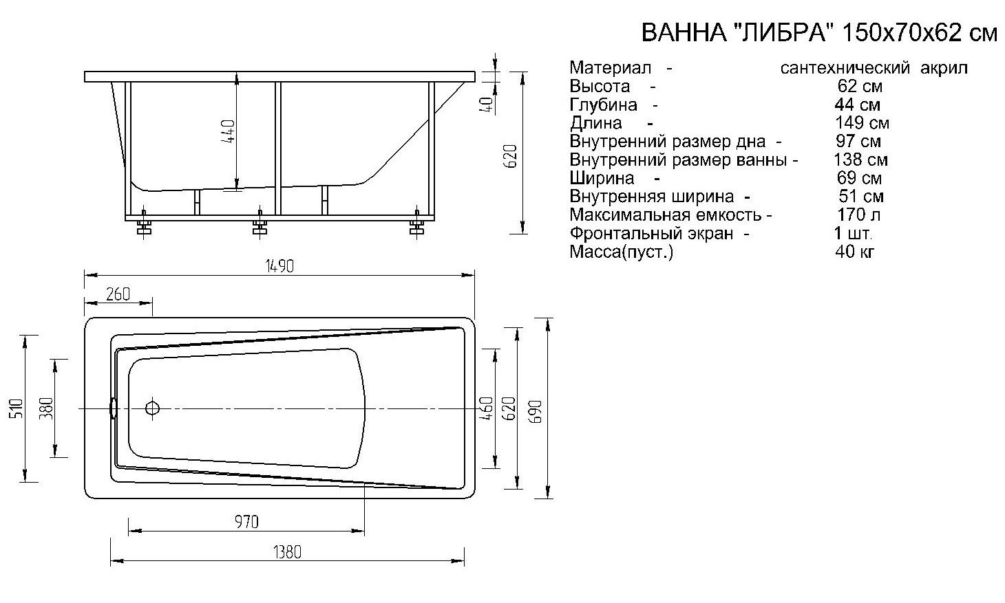 Габариты (Д Ш), см: 150х70Высота с опорой, см: 62Объем, л: 170 Форма: прямоугольнаяМонтаж: пристеннаяРасположение перелива: стандартноеДиаметр слива ванны, см: 5,2Материал: 100% литьевой акрилТолщина акрилового листа, мм: 4Гарантия: 20 летСтрана: Россия Вид опоры: каркас сборно-разборный сварной, есть в комплектеЭкран: фронтальный в комплектеСлив-перелив: есть, в комплектеНескользкая поверхность: даПодголовник: приобретается отдельноРучки: приобретаются отдельно Система гидромассажа: установка по желаниюАэромассаж: установка по желаниюХромотерапия: установка по желаниюРучки, поручни для ванны: установка по желаниюВстроенные смесители: установка по желаниюИзменение конструкции каркаса: установка по желаниюОзонирование: нет, установка не предусмотренаЗащита от сухого пуска: установка по желаниюУправление: любое по желанию-