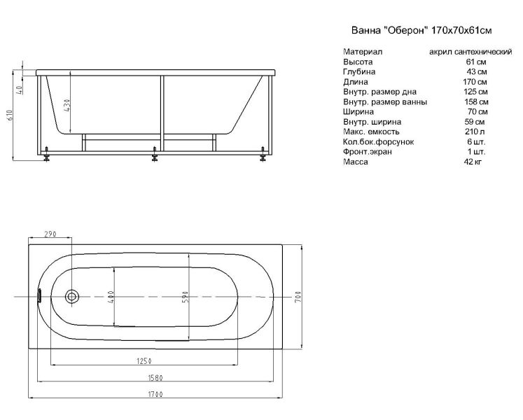 Габариты (Д Ш), см: 160х70Высота с опорой, см: 61Объем, л: 195 Форма: прямоугольнаяМонтаж: пристеннаяРасположение перелива: стандартноеДиаметр слива ванны, см: 5,2Материал: 100% литьевой акрилТолщина акрилового листа, мм: 4Гарантия: 20 летСтрана: Россия Вид опоры: каркас сборно-разборный сварной, есть в комплектеЭкран: фронтальный в комплектеСлив-перелив: есть, в комплектеАнтискользящее покрытие: нескользкая поверхностьПодголовник: приобретается отдельноРучки: приобретаются отдельно Система гидромассажа: установка по желаниюАэромассаж: установка по желаниюХромотерапия: установка по желаниюРучки, поручни для ванны: установка по желаниюВстроенные смесители: установка по желаниюИзменение конструкции каркаса: установка по желаниюОзонирование: нет, установка не предусмотренаЗащита от сухого пуска: установка по желаниюУправление: любое по желанию
