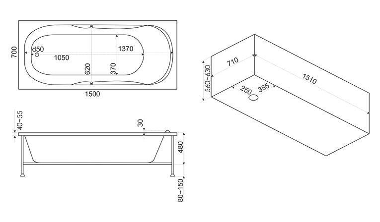 Ширина:700 ммВысота:630 ммГлубина:430 ммДлина:1500 ммЦвет:Белый