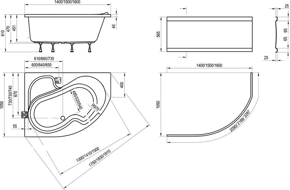• аксессуары: передняя панель, сточный комплект для ванны, подголовник, ручки
