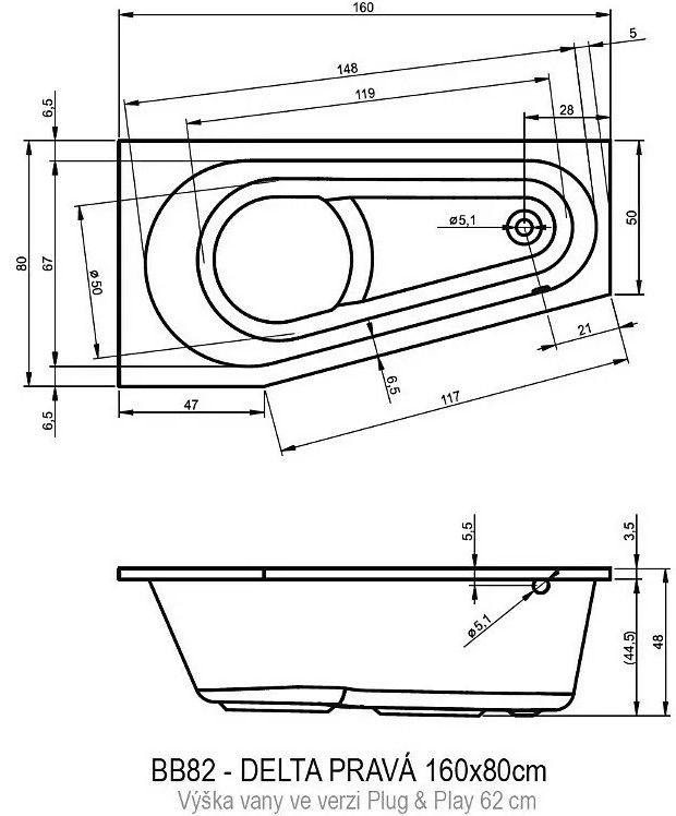 Акриловая ванна Riho Delta Plug and Play B068007005 R 160х80см белый