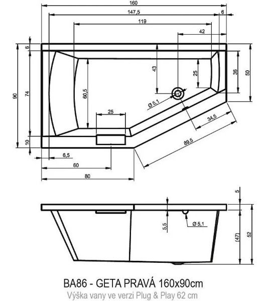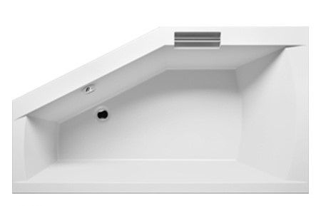 ?Асимметричная ванна RIHO Geta 160x90 R Plug & Play из глянцевого белого акрила, со скошенными краями и встроенной хромированной ручкой представляет собой полностью собранную на заводе конструкцию.