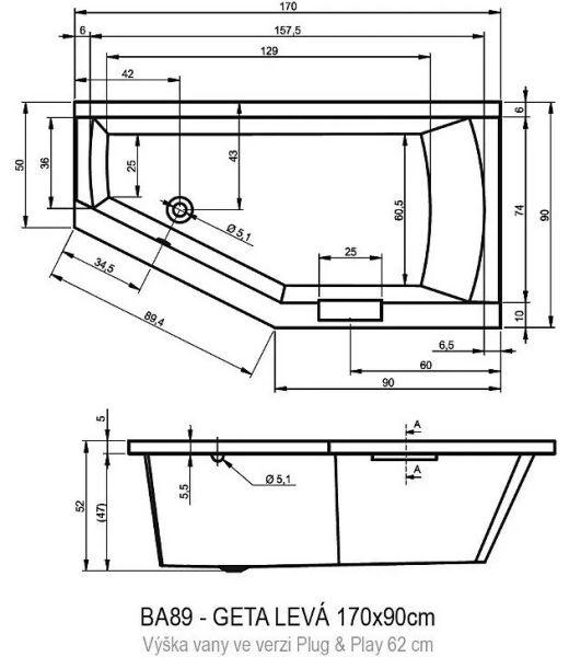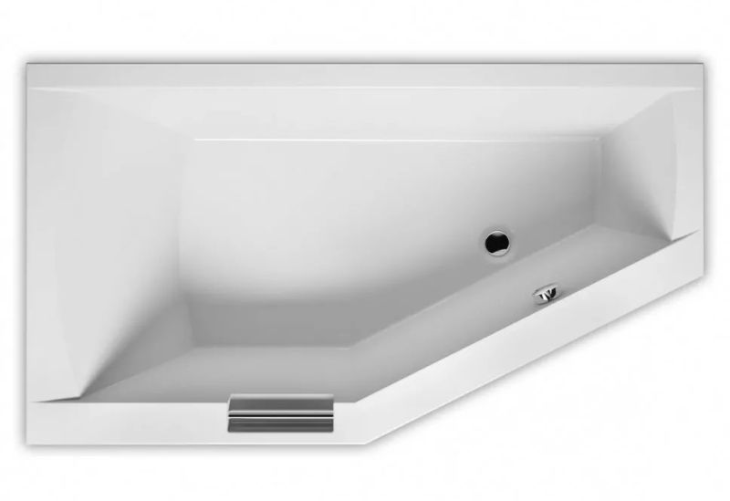 ?Асимметричная ванна RIHO Geta 170x90 L Plug & Play из глянцевого белого акрила, со скошенными краями и встроенной хромированной ручкой представляет собой полностью собранную на заводе конструкцию.