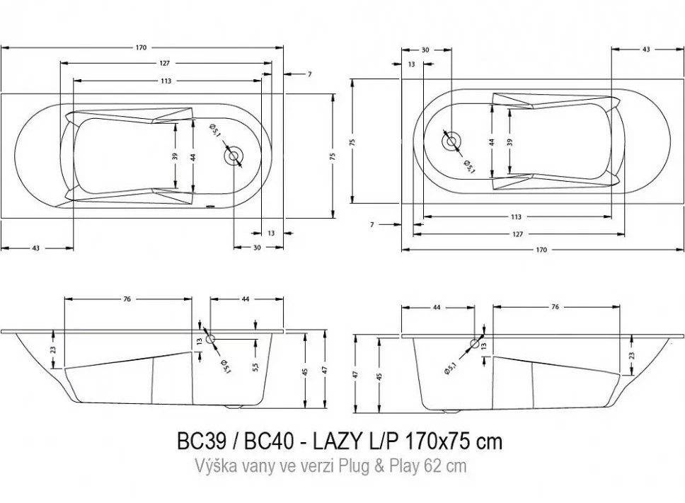 Прямоугольная? ванна RIHO Lazy 170x75 R Plug & Play, из глянцевого белого акрила с боковым сливом-переливом, представляет собой полностью собранную на заводе конструкцию.