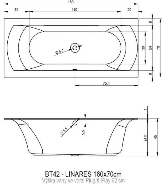 Прямоугольная?ванна RIHO Linares 160x70 R Plug & Play, из глянцевого белого акрила с закругленной внутренней формой и центральным сливом, представляет собой полностью собранную на заводе конструкцию.