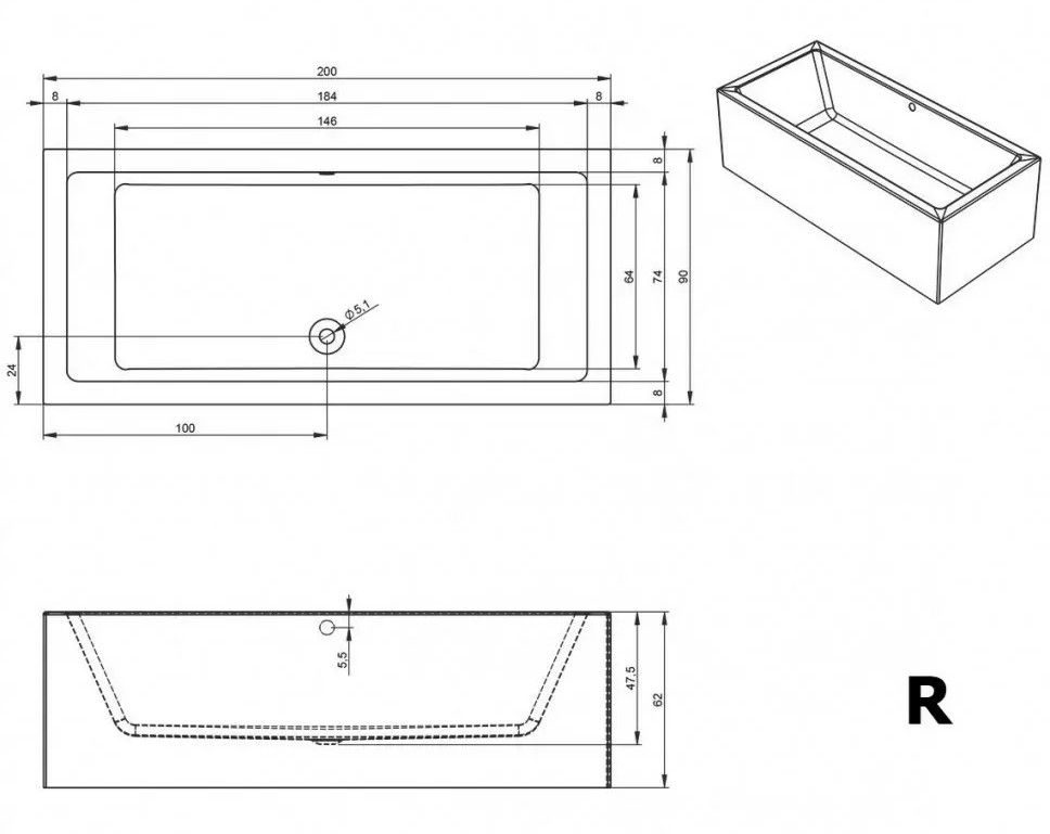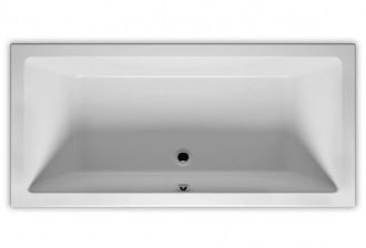 Прямоугольная? ванна RIHO Lugo 200x90 R Plug & Play, из глянцевого белого акрила с прямыми симметричными спинками, гладкой внутренней формой и центральным сливом, представляет собой полностью собранную на заводе конструкцию.