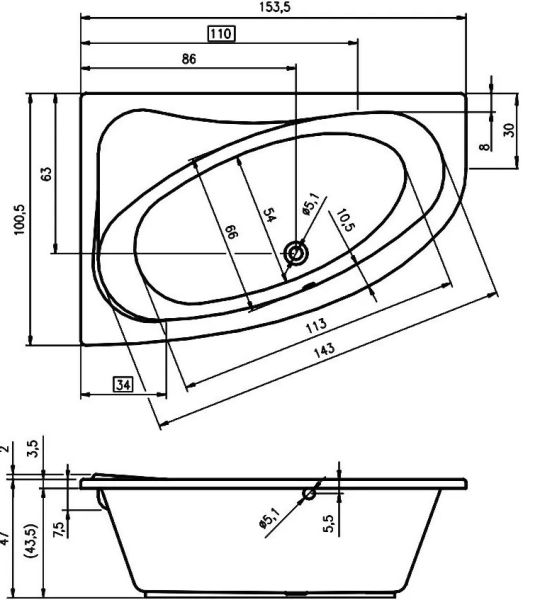 Асимметричная акриловая ванна RIHO Lyra 153x100R изготовлена из высококачественного листа акрила глянцевого белого цвета.