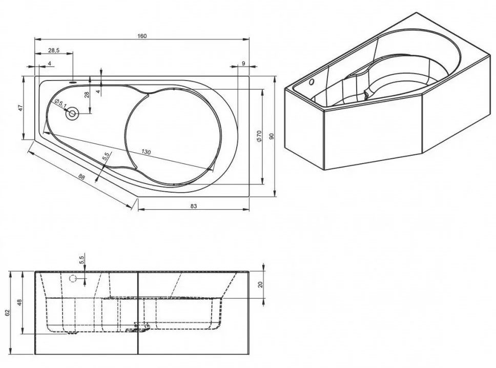 Отдельно стоящая асимметричная ванна RIHO Yukon 160x90 L PLUG & PLAY изготовлена из белого глянцевого акрила. Просторная закругленная спинка шириной 90 см имеет прекрасную лежачую форму, а в боковые стенки встроены продуманные подлокотники.
