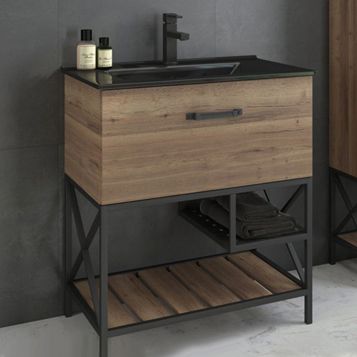 В комплекте черная матовая раковина с прямоугольной чашей. В основе тумбы - каркас из стального профиля окрашенный черной эмалью с нижней широкой полкой и средней полкой для полотенец. Стильная ручка ящика в том же цвете что и каркас. Тумба подготовлена для подключения водоснабжения снизу.