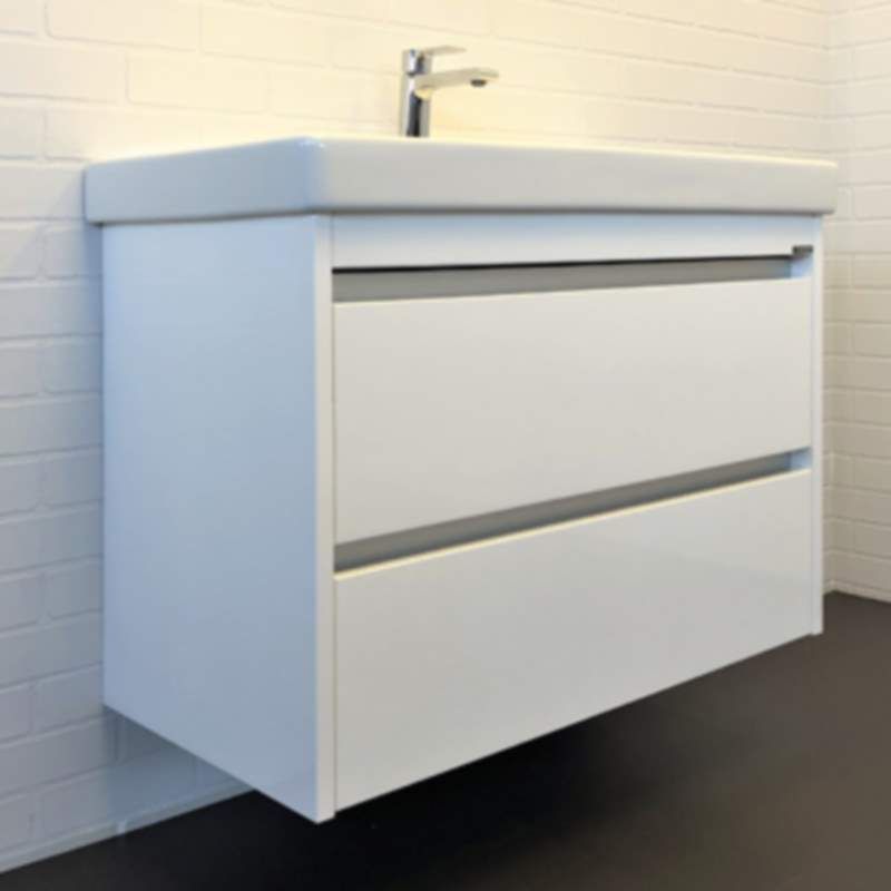 Подвесная тумба с двумя выдвижными ящиками оснащенными системой плавного закрывания. Фасады и боковины покрыты белой глянцевой эмалью.