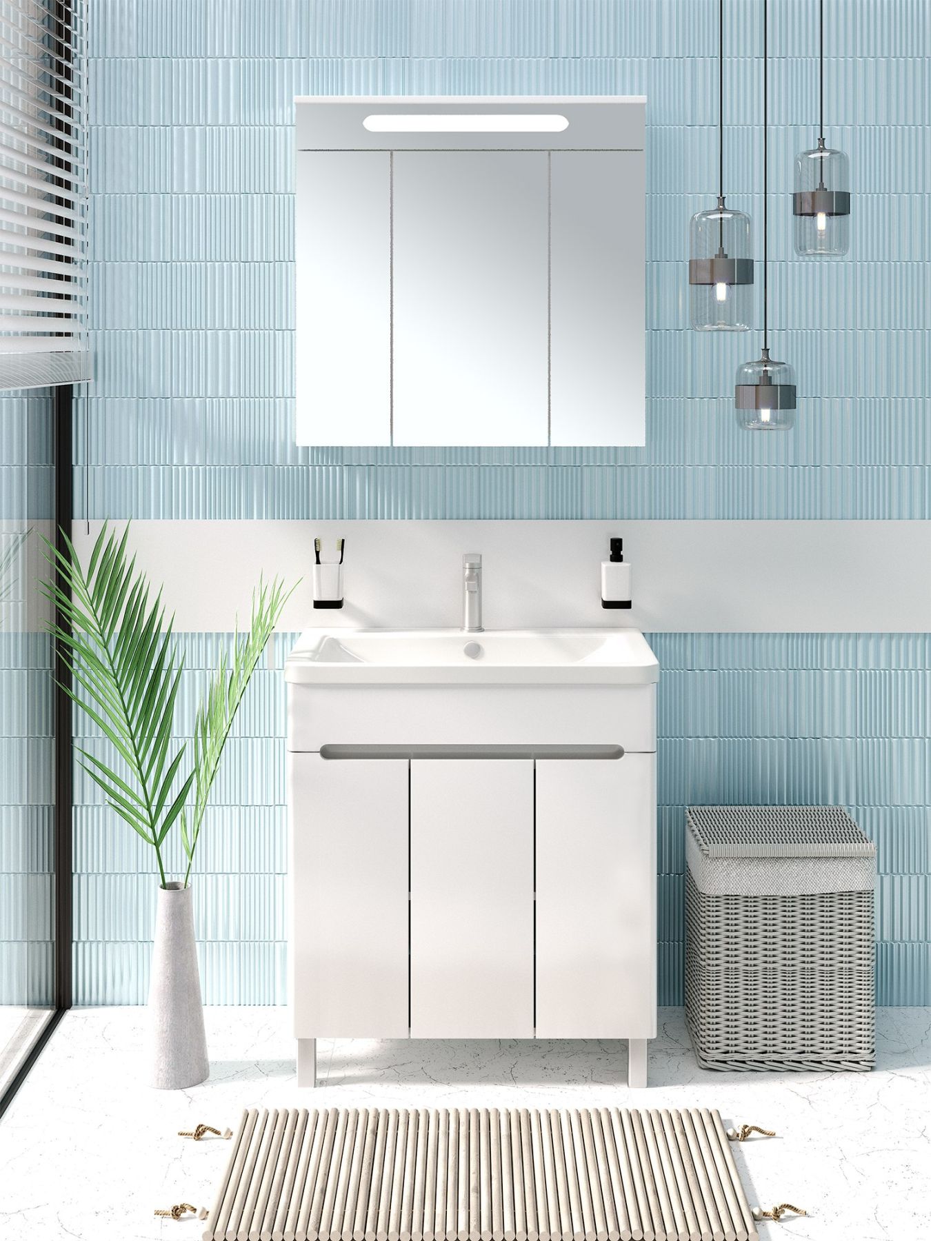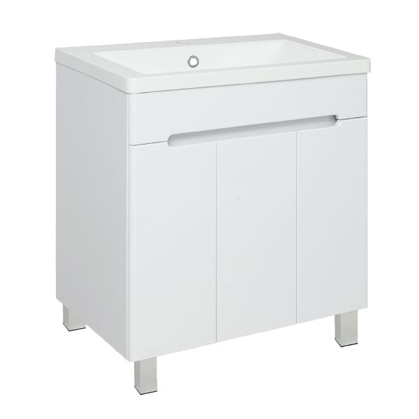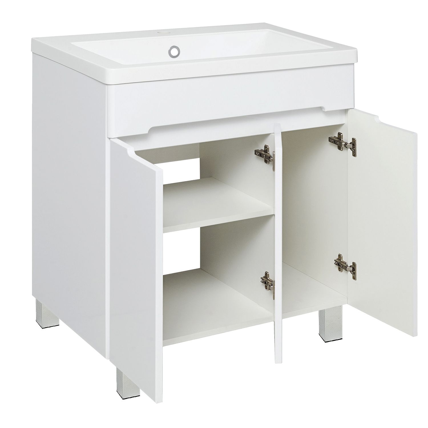 Тумба под умывальник напольная с тремя распашными дверками. Петли со встроенным доводчиком, ножки хром - 2шт, ножки пластик - 2шт.