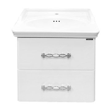 Тумба-умывальник с двумя выкатными ящиками, оснащенными системой плавного закрывания. Фасады выполнены из МДФ и покрыты белой глянцевой эмалью. Раковина с овальной чашей и оригинальными отверстиями перелива.