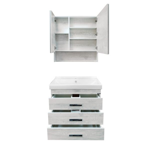 Название: Тумба-умывальник Артикул: Никосия 60Н Варианты цвета корпуса и фасадов: Дуб белый Материал корпуса и фасадов: влагостойкое ЛДСП Габариты (ШхВхГ): 600*860*400 мм Комплектация: раковина Fest 60 (санитарный фарфор) Напольная тумба с тремя выдвижными ящиками оснащенными системой плавного закрывания. Оригинальные эргономичные металлические ручки.