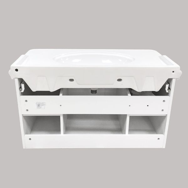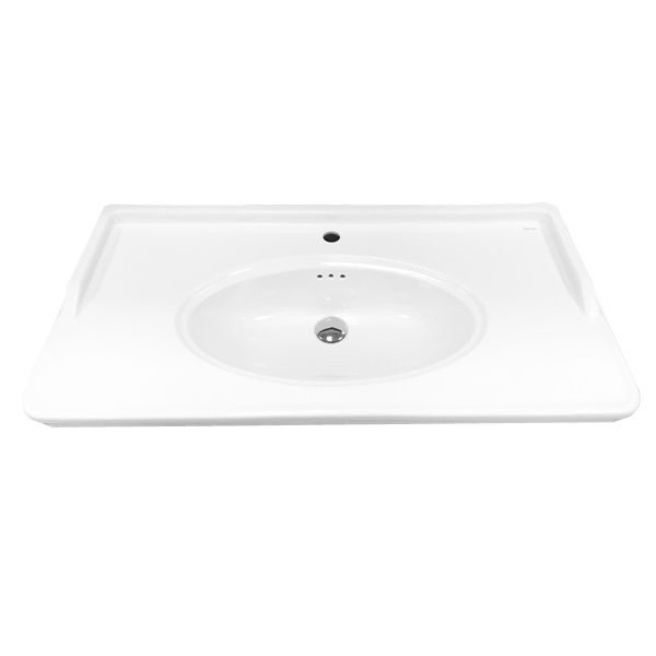 Тумба-умывальник с тремя распашными створками, оснащенными системой плавного закрывания. Фасады выполнены из МДФ и покрыты белой глянцевой эмалью. Широкая раковина столешница с овальной чашей и оригинальными отверстиями перелива.