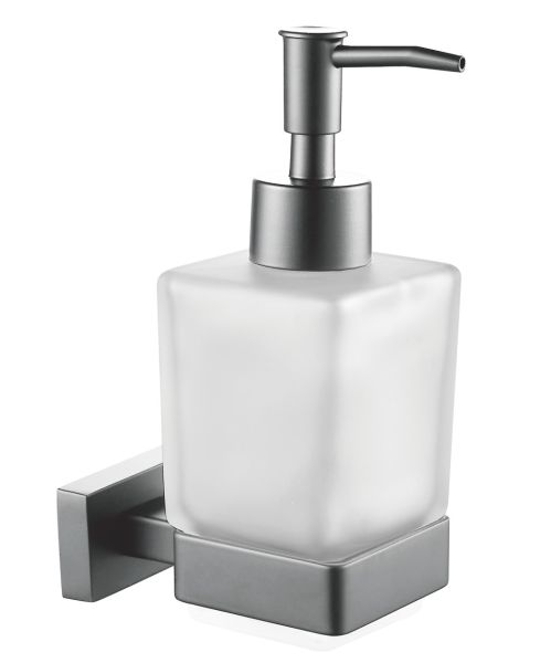 Дозатор жидкого мыла Shevanik SG5644T, оружейная сталь.Материал: латунь/стекло.Монтаж: настенный.Форма розетки: прямоугольная.