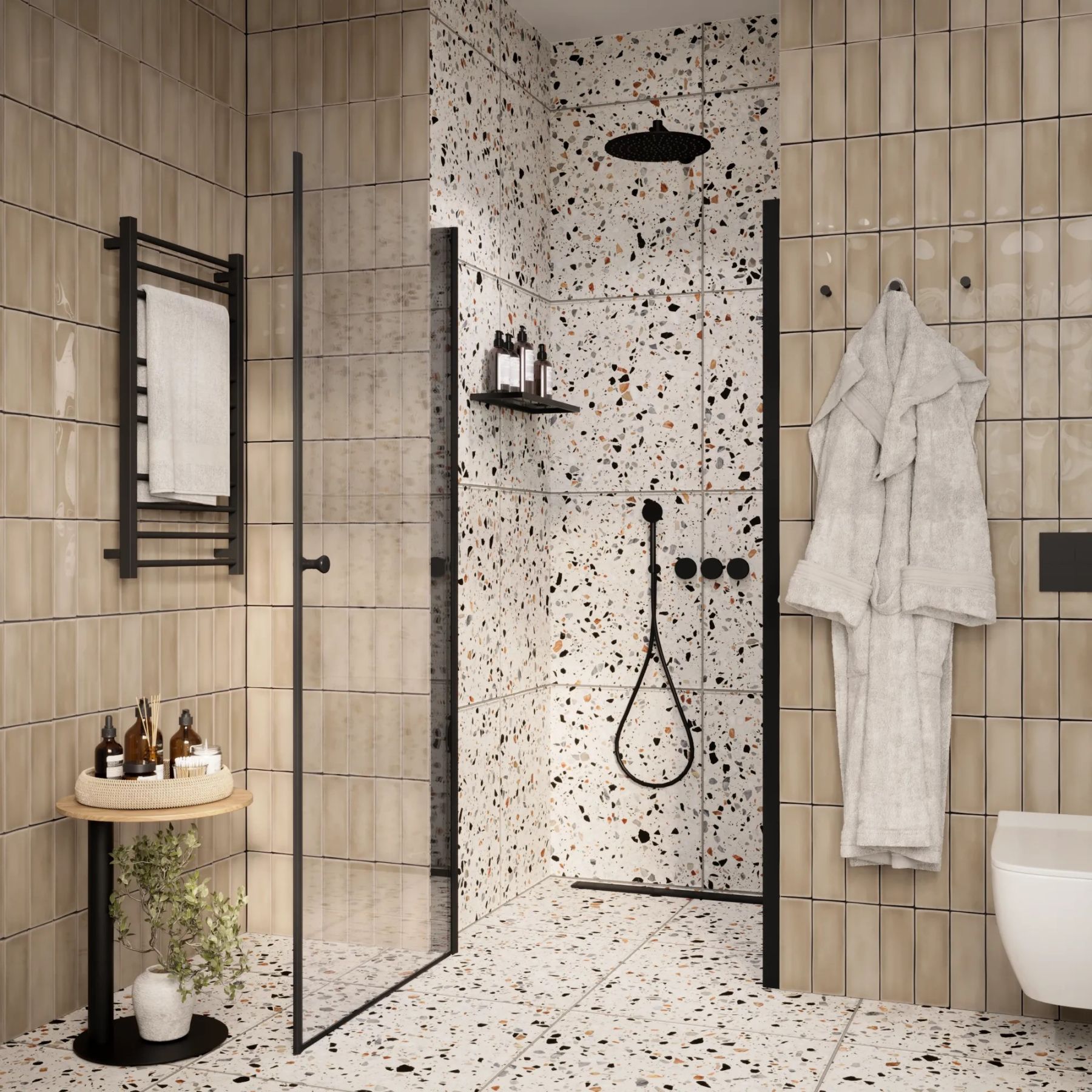 Душевая дверь помогает зонировать помещение на отдельные функциональные участки.