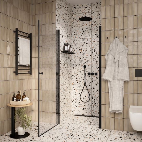 Защищает ванную комнату от брызг воды. Пол возле душевой зоны остается сухим, что снижает шансы поскользнуться после водных процедур.