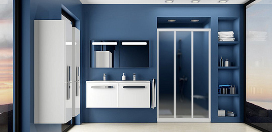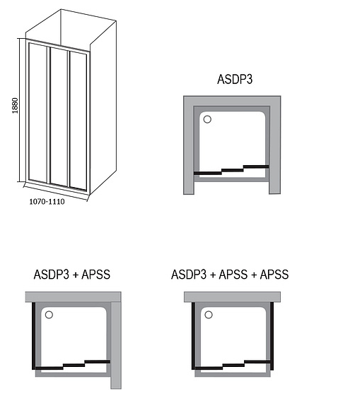 Изделие состоит из одной неподвижной части и двух подвижных частей. Повернув изделие на 180°, получите левый/правый варианты входа. Устанавливается в облицованный кафелем угол ванной комнаты на поддоны RAVAK ANETA, ANGELA, PERSEUS, PERSEUS PRO, PERSEUS PRO FLAT, PERSEUS PRO CHROME, GIGANT PRO, GIGANT PRO FLAT, GIGANT PRO CHROME или непосредственно на пол со встроенным душевым каналом или трапом. Комбинируя одну неподвижную стенку типа APSS с душевыми дверьми можно создать «Г»-образный душевой уголок. С помощью двух неподвижных стенок типа APSS и душевых дверей образуете «П»-образный душевой уголок. Возможно изготовление атипичных душевых дверей.