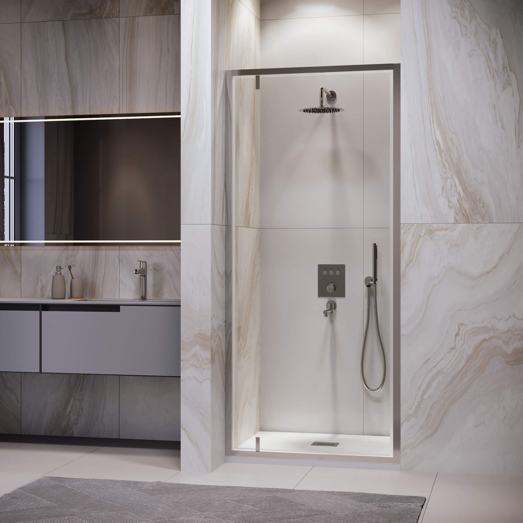 Элегантные стеклянные двери с пристенными профилями придают ванной комнате изысканность и строгость. Модели оснащены маятниковой петлёй, с защитой от провисания и подъёмом двери при открытии. Такой системой будет особенно удобно пользоваться если дверь установлена на плитку с встроенным трапом. Изделия оснащены Распашные двери открываются как наружу, так и внутрь, что обеспечит максимальный комфорт в процессе использования душевого пространства.Благодаря разнообразию размеров, подходят практически каждому клиенту.Ключевые характеристики:
