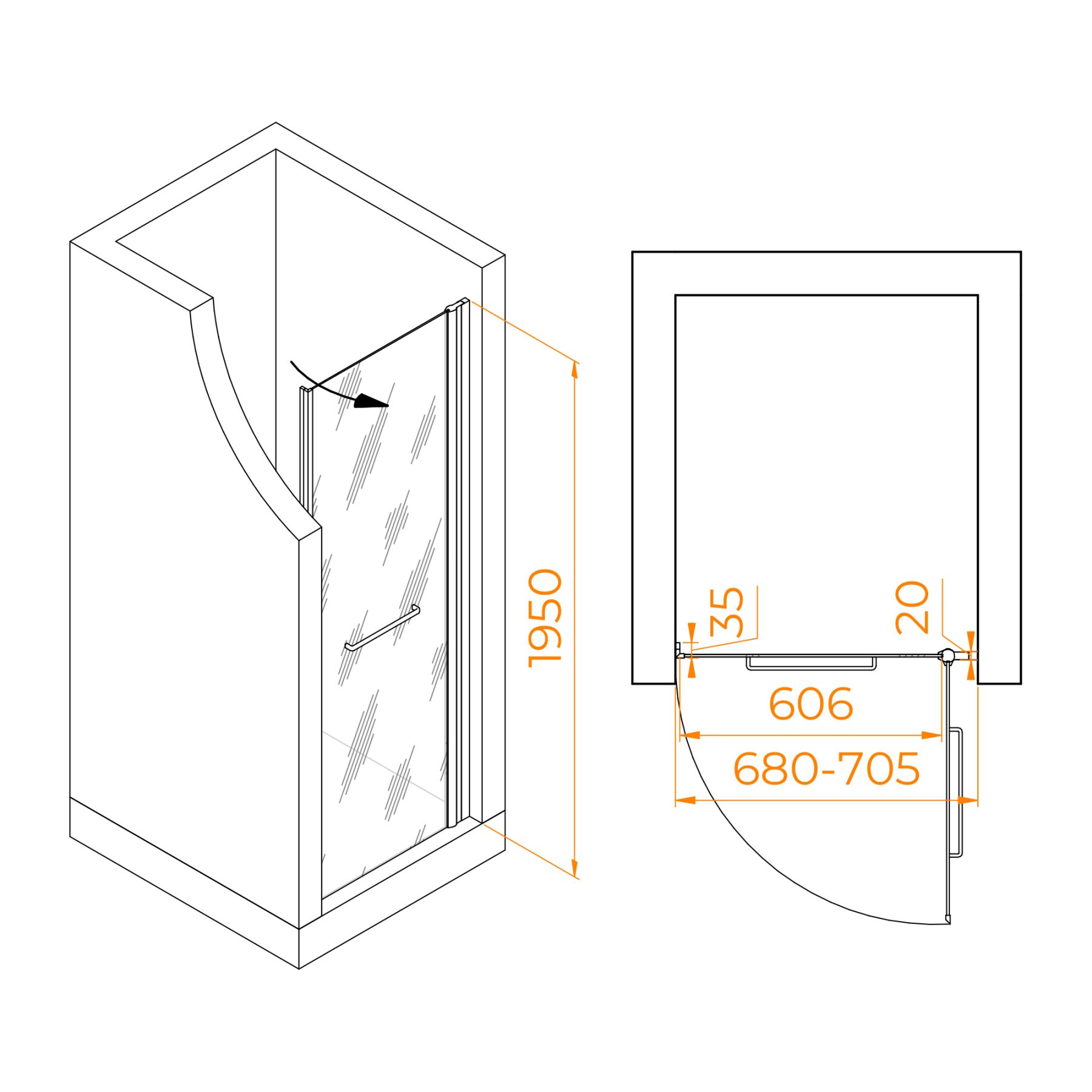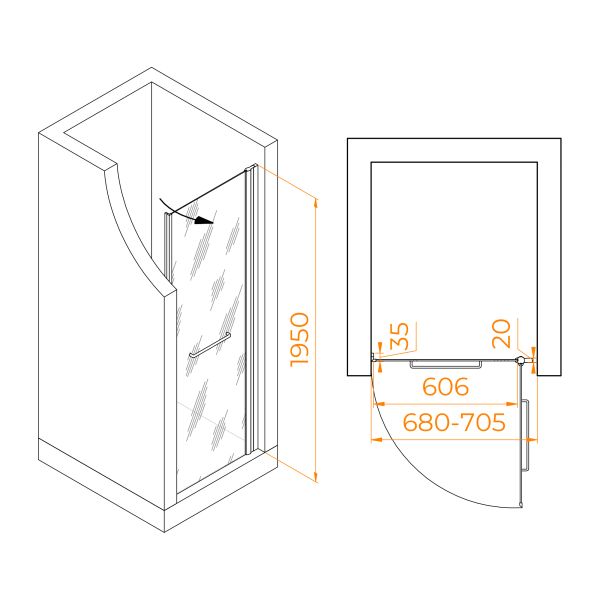 Душевая дверь распашная с маятниковой петлей (открытие только наружу). Маятниковые петли с функцией подъема двери. В комплекте нижняя пороговая планка. Стальная ручка - полотенцедержатель. Трап или поддон приобретается отдельно.