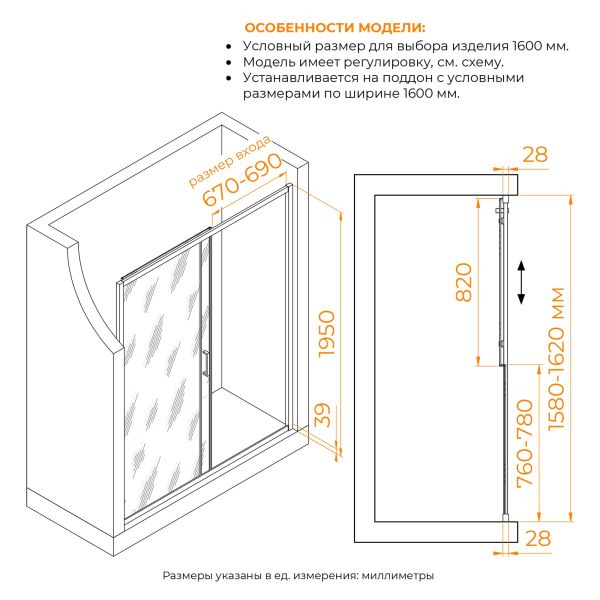 • Высота 1950 мм – обеспечивает комфорт и защиту от брызг