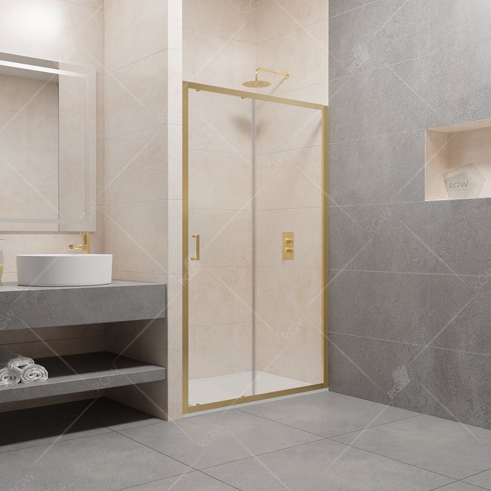 Душевая дверь раздвижная RGW PA-14. Ручка скоба из цинкового сплава, двойные верхние ролики. двойные отстегивающиеся нижние ролики, крышки верхнего профиля. Трап или поддон приобретается отдельно.Душевая дверь RGW Passage PA-14G 120x195 профиль золотой незаменимый элемент любой ванной комнаты от миниатюрного санузла в многоквартирной высотке, до огромного помещения в загородном доме. Внутри ниши за душевой дверью можно разместить качественную сантехнику на ваш выбор, установить современную душевую стойку или встроить душевую систему скрытого монтажа, а также повесить удобные полочки для банных принадлежностей.Душевая дверь RGW Passage прямоугольной формой размером 120 см высотой 195 см создаст значительное пространство внутри, для вашего комфорта. Цвет профиля RGW Passage - золото, это бесподобный вариант для современного интерьера. Конструкция дверей 41081412-16 раздвижная, не требует дополнительного пространства для открывания и позволяет оптимизировать пространство ванной комнаты. Стекло у душевой двери RGW 41081412-16 представлено в прозрачном исполнении, толщиной 6 мм, отлично будет гармонировать с любым дизайном интерьера ванной. Универсальность ориентации RGW Passage позволяет не задумываться о, том в какой именно угол нужно устанавливать, и даже при изменении положения других элементов сантехники, можно без проблем изменить ориентацию. RGW Passage 41081412-16 спроектирован дизайнерам с четким соблюдением всех значительных элементов современного стиля. Наличие покрытия анти-капля надежно защитит стекло от налета, подтёков и других загрязнений, а так же сохранит чистоту стекла и эстетичный внешний вид.Все душевые ограждения RGW, производятся с жестким соблюдением современных стандартов качества и применение материалов безопасных для здоровья, благодаря тому, что родна производства Германия. Душевая дверь RGW Passage PA-14G 120x195 профиль золотой гармонично вольется в ваш интерьер и подарит ему дополнительные современные элементы.