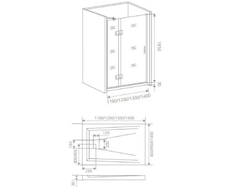 - - Прямые (от стены до стены, артикул WTW) – ограждения с одной открывающейся дверью: 1100, 1200, 1300, 1400 мм.