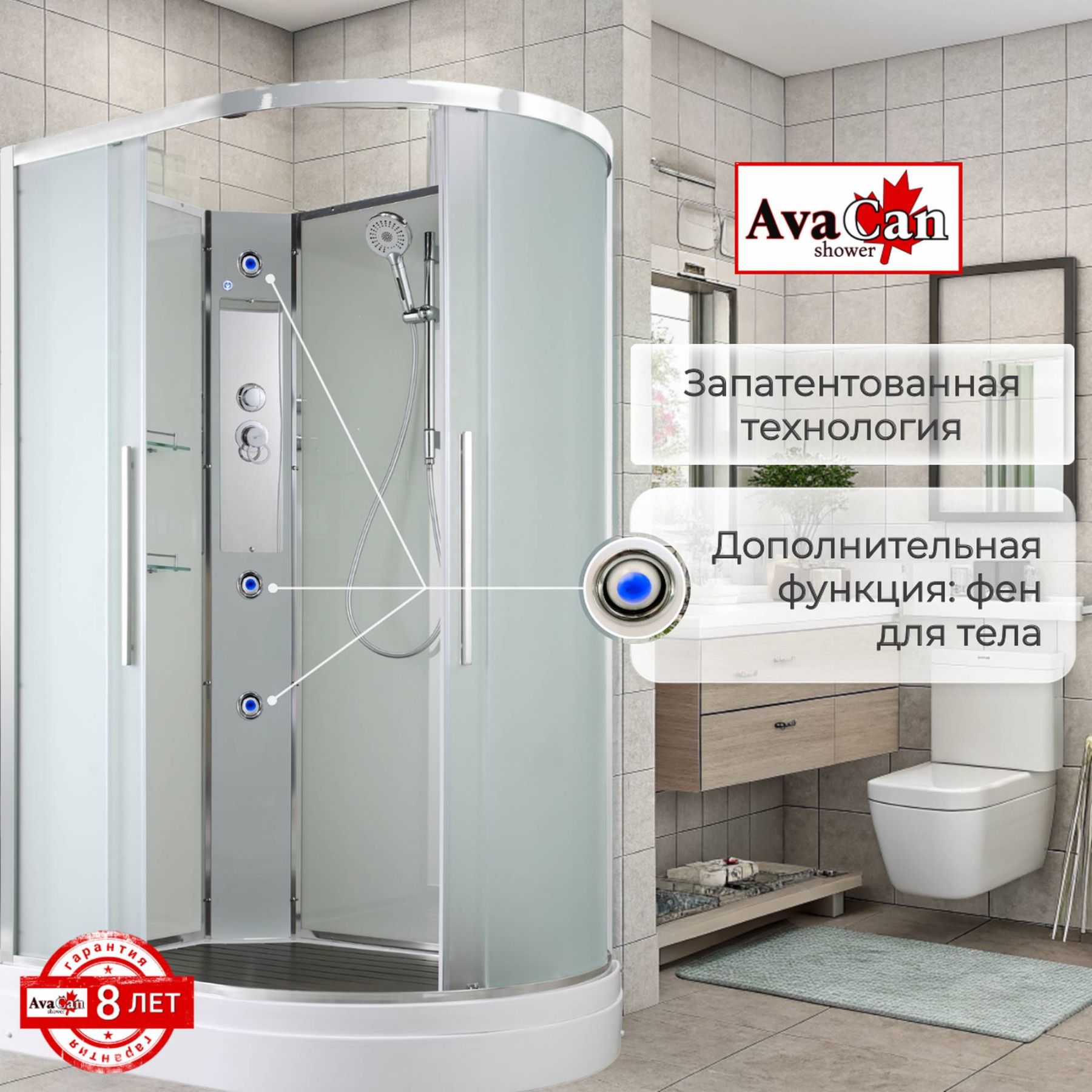 Стильная душевая кабина AvaCan EM2912LN сочетает в себе высокую функциональность, практичность и надежность. При изготовлении применяется безопасное закаленное стекло толщиной 5 мм (матовое), надежно фиксируемое алюминиевым профилем. Сборка без силикона (увеличивает срок службы), внутренняя сборка(облегчает установку и ревизию; позволяет установить в ограниченном пространстве), смеситель резьбовой (без хомутов). Съемный экран поддона (позволяет осуществлять ревизию сифона). Цвет профиля  хром. Двойные металлические ролики дверей (увеличивают срок службы).В комплекте : душевая штанга, две полочки , арома-лейка с витамином С (картридж съемный),полимерная вставка в поддон(имитация дерева),сифон, ручки дверей из нержавейки , двойные ролики .