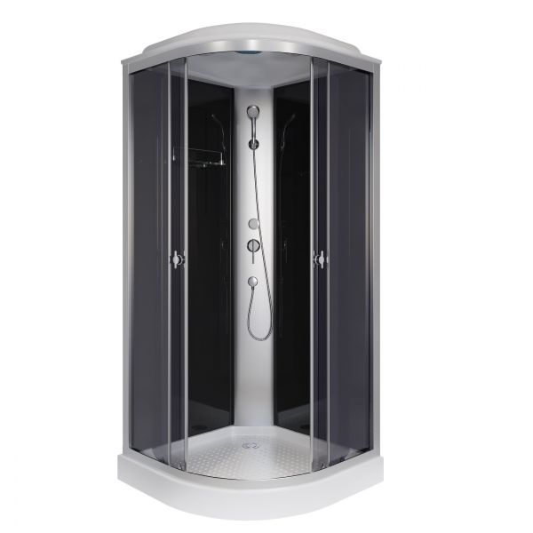 Двери и передние не подвижные стенки, сделаны из каленого стекла тонированные.Смеситель имеет два положения, включение тропического душа и дополнительной душевой лейки. Механизм керамический картридж.Комплектация: Поддон, сифон, панель, 4 профиля, 2 передние неподвижные стенки, 2 двери, 2 задние стенки, ручки, 4 ролика одноколесные, центральная панель, смеситель. крыша, полочка.