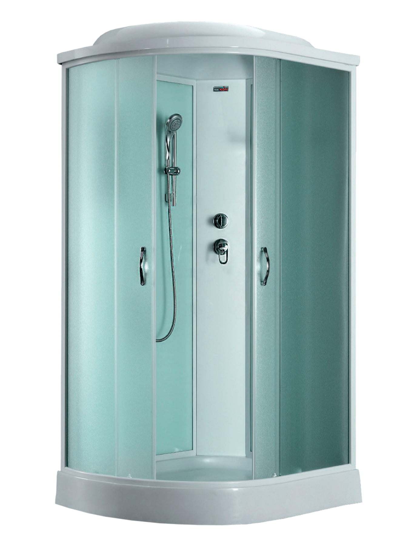 Полотна двери выполнены из матового стекла, а задняя стенка из прозрачного стекла. Это придает кабине элегантный и стильный вид, а также позволяет сохранить конфиденциальность. Профиль выполнен из алюминия белого цвета, что дает ему прекрасный вид и защищает от коррозии.