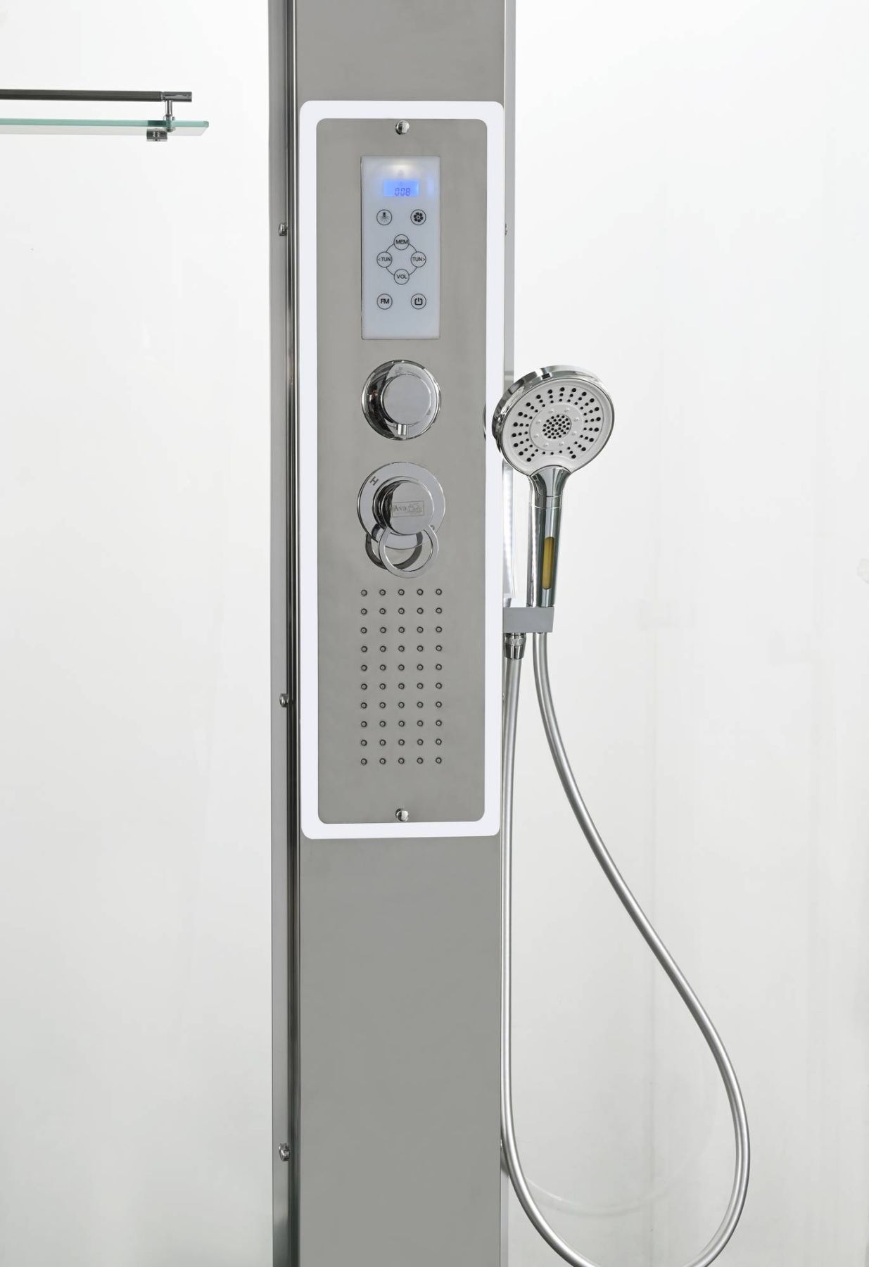 Стильная душевая кабина AvaCan сочетает в себе высокую функциональность, практичность и надежность. При изготовлении применяется безопасное закаленное стекло, надежно фиксируемое алюминиевым профилем.Профиль сделан из алюминия повышенной прочности. Сборка без силикона (увеличивает срок службы, защищает от протечек), внутренняя сборка (облегчает установку и ревизию; позволяет установить в ограниченном пространстве и обойтись без демонтажа других сантехнических приборов), смеситель резьбовой (без хомутов). Двойные металлические ролики дверей (распределение нагрузки на два ролика, увеличивают срок службы). Душевая штанга(позволяет регулировать по высоте ручную лейку), ручная арома-лейка с витамином С (картридж в комплекте,есть возможность замены или удаления картриджа), полочки(из стекла, с ограничителем), сифон с гидрозатвором, сенсорный пульт управления с функциями: блютуз, LED подсветка, радио, вытяжка, гидромассаж спины, тропический (верхний) душ.