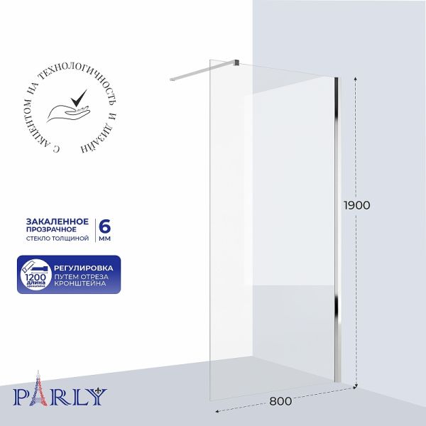 Душевая перегородка Parly T80 80х190 профиль Хром стекло прозрачное Подробнее