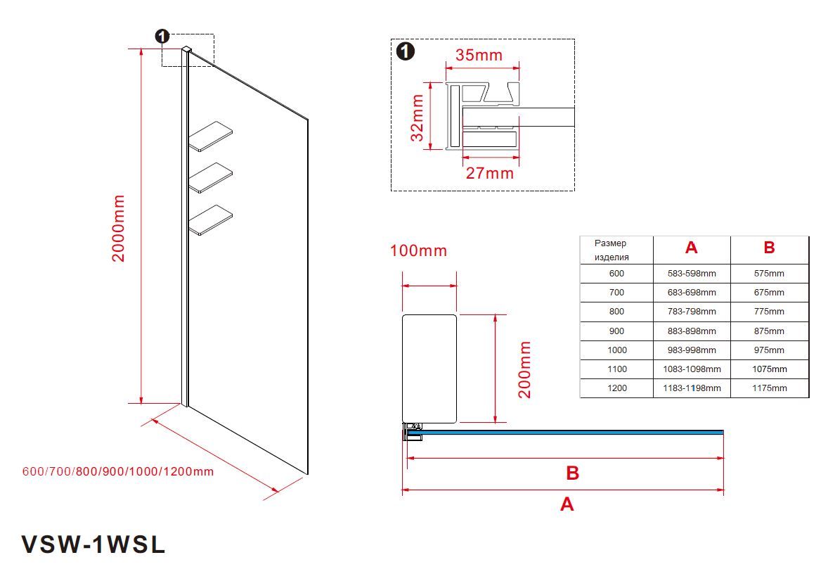 Душевая перегородка Vincea Walk-In VSW-1HWS900CLB, 900*2000, черный, стекло прозрачноe