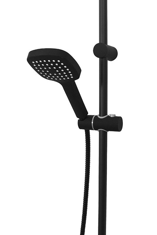 Душевая система в комплекте: однозахватный смеситель для ванны с изливом (190 мм.) и керамическим картриджем, верхний душ 230х230 мм. и ручной душ 120 мм (1 режим) с защитой от известкового налета, регулируемый по наклону держатель верхнего и ручного душа, душевой шланг 1,5 м. (в металлической оплетке, с защитой от перекручивания), керамический дивертор. Штанга 970 мм. с возможностью установки в старые отверстия. Цвет матовый черный, за которым просто ухаживать мягкой салфеткой, получен порошковой окраской с многоступенчатой системой подготовки и высокотемпературной обработкой.
