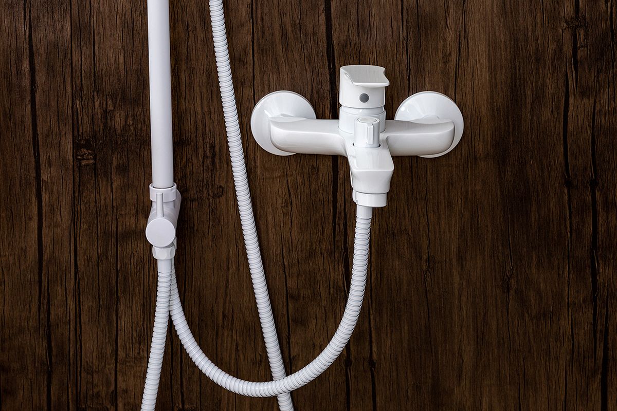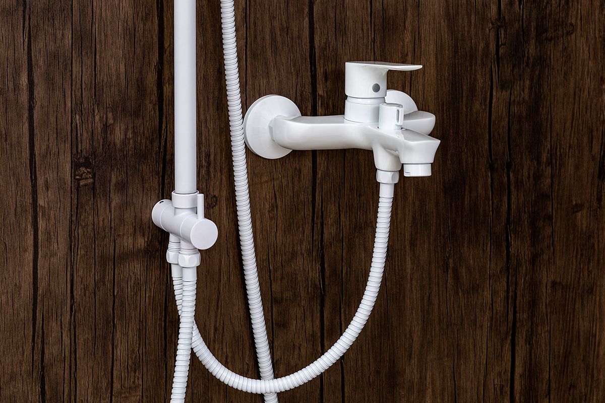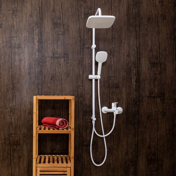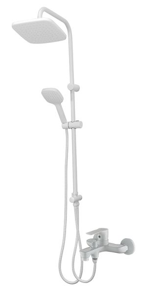 Душевая система в комплекте: однозахватный смеситель для ванны с изливом (190 мм.) и керамическим картриджем, верхний душ 230х230 мм. и ручной душ 120 мм (1 режим) с защитой от известкового налета, регулируемый по наклону держатель верхнего и ручного душа, душевой шланг 1,5 м. (в металлической оплетке, с защитой от перекручивания), керамический дивертор. Штанга 970 мм. с возможностью установки в старые отверстия. Цвет глянцевый белый.
