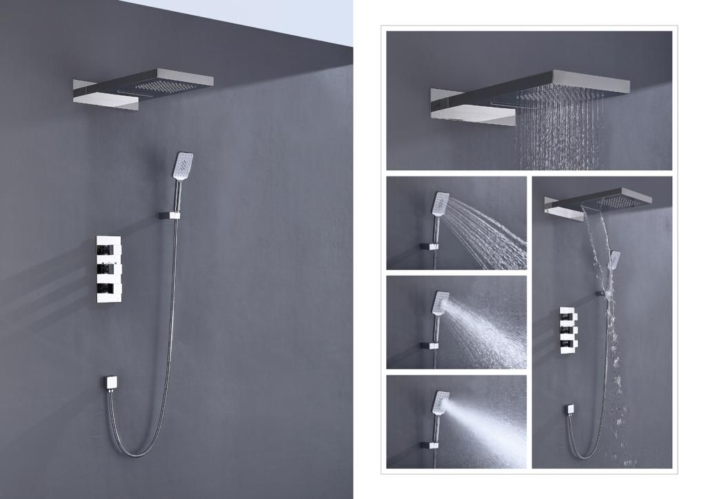 Душевая система скрытого монтажа, с термостатом с прямоугольной лейкой в стиле модернДушевая система сделана из латуни класса А