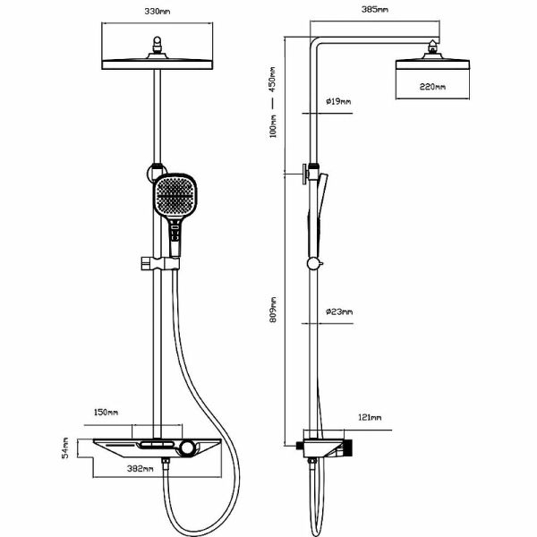 Регулируемая по высоте душевая штанга и держатель ручного душа.