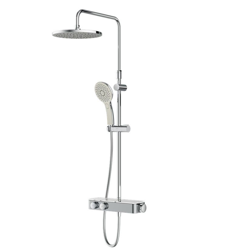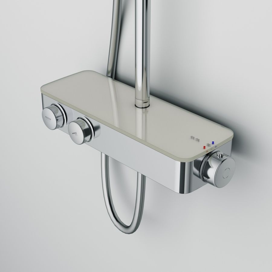 Верхняя часть смесителя выполнена из глянцевого стекла и является интегрированной полочкой для нужных мелочей при приёме душа;