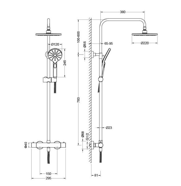 • регулируемая душевая штанга из нержавеющей стали, выдвигающаяся до 1383 мм в высоту