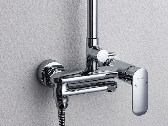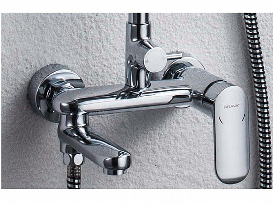 Душевая стойка для ванны Bravat Opal с большим круглым верхним душем и смесителем. Серия известна не только своим качеством, но и высоким уровнем эргономики.