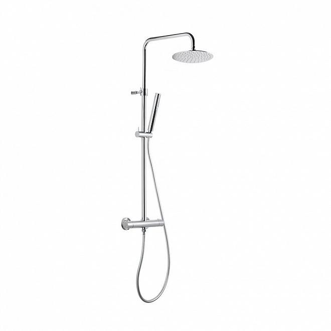 Душевая колонна с термостатическим смесителем в комплекте с переключателем потоков, круглой верхней одноструйной душевой лейкой из нержавеющей стали, с ручным душем и шлангом из ПВХ.