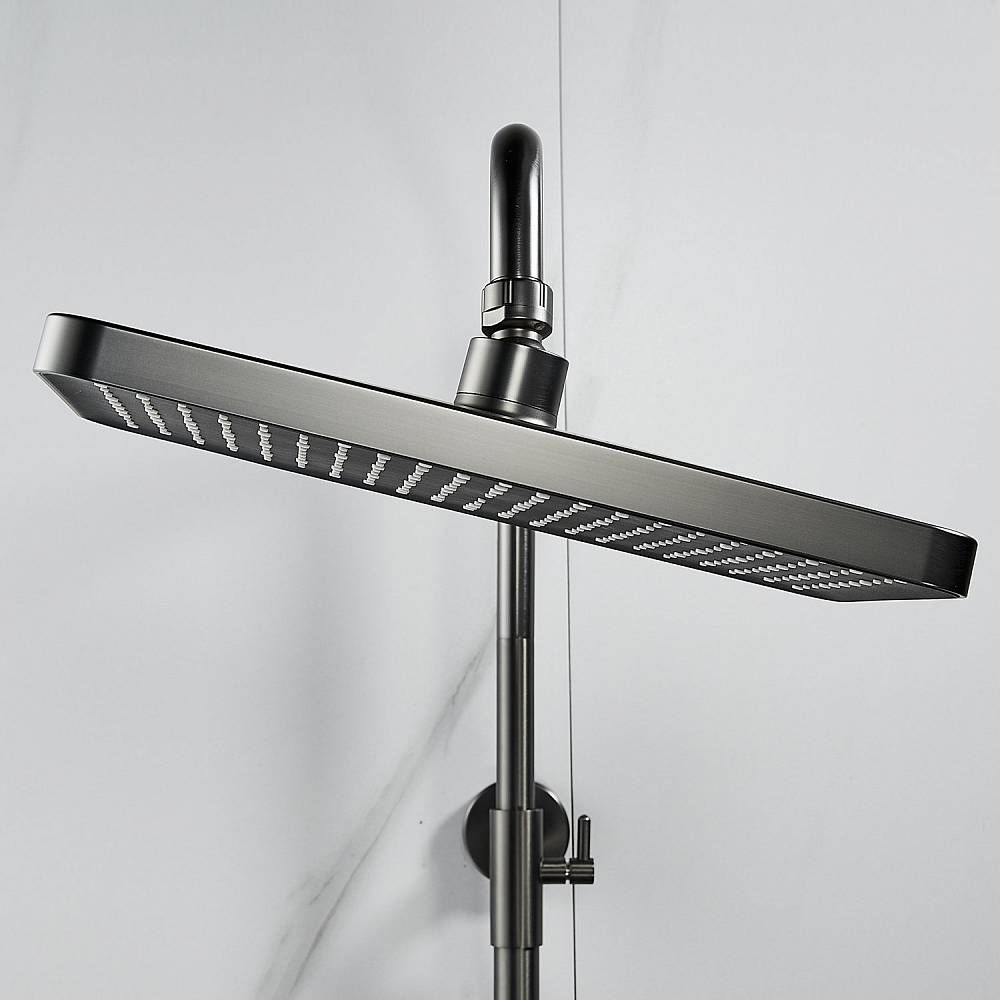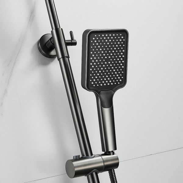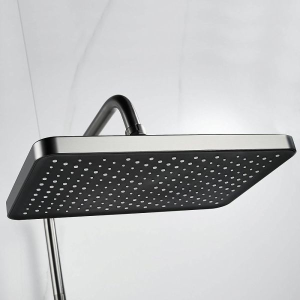 Душевая система Shevanik S9936T, оружейная сталь.Количество режимов струи: 3.Размер верхнего душа: 32x21 см.Управление: рычажное.Излив для наполнения ванны: да.