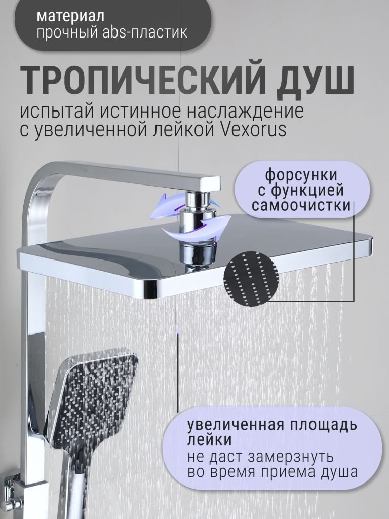 Душевая система с тропическим душем Vexorus - это система, которая превратит вашу ванную комнату в настоящий уголок роскоши и комфорта. Изделие выполнено в хромовом цвете, что позволяет гармонично его использовать в современном интерьере.