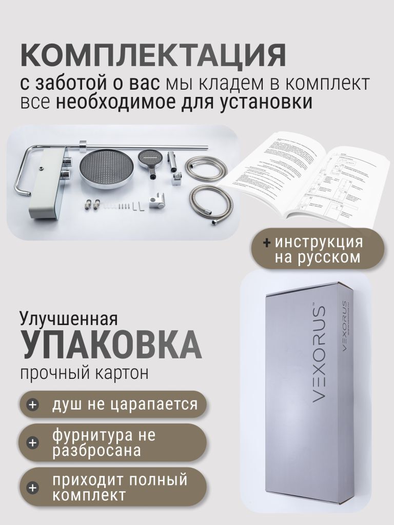 Душевая система с краном бренда Vexorus - это идеальный выбор для тех, кто ценит качество, стиль и комфорт. Представленное оборудование является надежным и долговечным, что позволяет использовать его на протяжении многих лет.