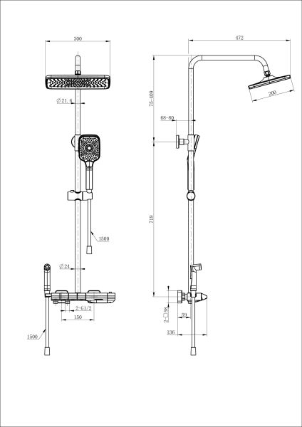 Душевая система с техническим душем и термостатом WONZON & WOGHAND MUSE Piano, Черный матовый (WW-B4132-A-MB)