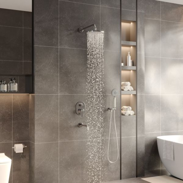 Душевой комплект BERGES - встраиваемый душевой комплект обладает двухрежимной системой и состоит из верхней лейки - «тропического ливня», ручного душа и смесителя. Лейка верхнего душа имеет инновационную систему самоочистки в виде гибких силиконовых вставок на форсунках душа, которые защищают изделие от известковых отложений. Изготовлены оба душа из ABS пластика, имеют хромоникелевое покрытие, которое выглядит безупречно на протяжении всего периода эксплуатации. Шланг выполнен из нержавеющей стали (внутри epdm), смеситель с латунным корпусом имеет керамический картридж с пропускной способностью 28 л/мин, все держатели и кронштейны сделаны из латуни и нержавеющей стали.Скрытый монтаж комплекта позволяет создавать красивое и эргономичное внутреннее пространство всего помещения.