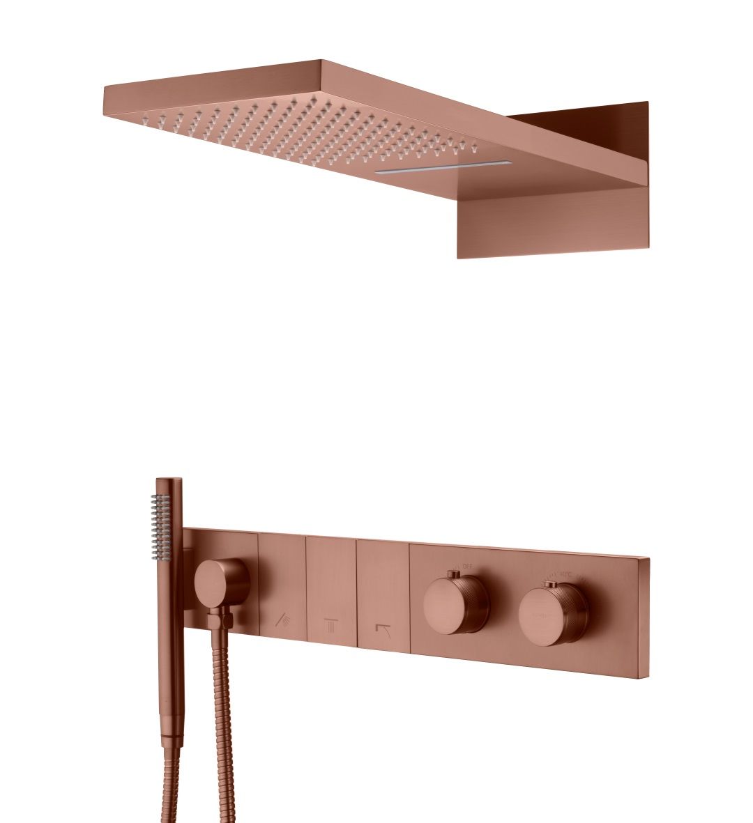 Верхний душ размером 550мм*230мм с функцией тропического душа и водопада. Форсунки soft-silicone с функцией антикальк и комфортной очисткой.